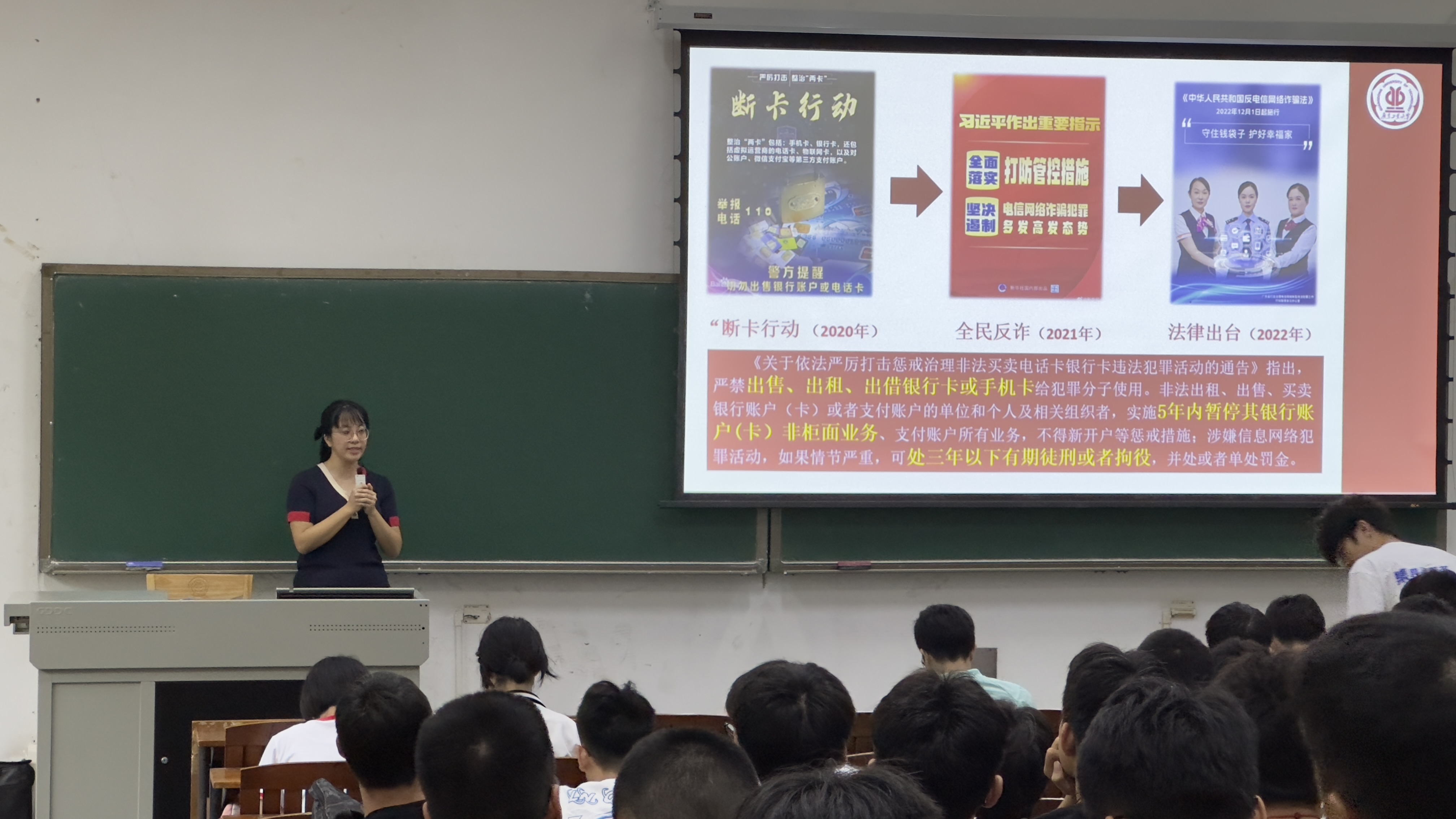 在教学5号楼104和106召开了2023级本科生和研究生新生安全教育大会,本次活动邀请了保卫处陈晓雪老师和番禺区反诈中心黄力宇警官。