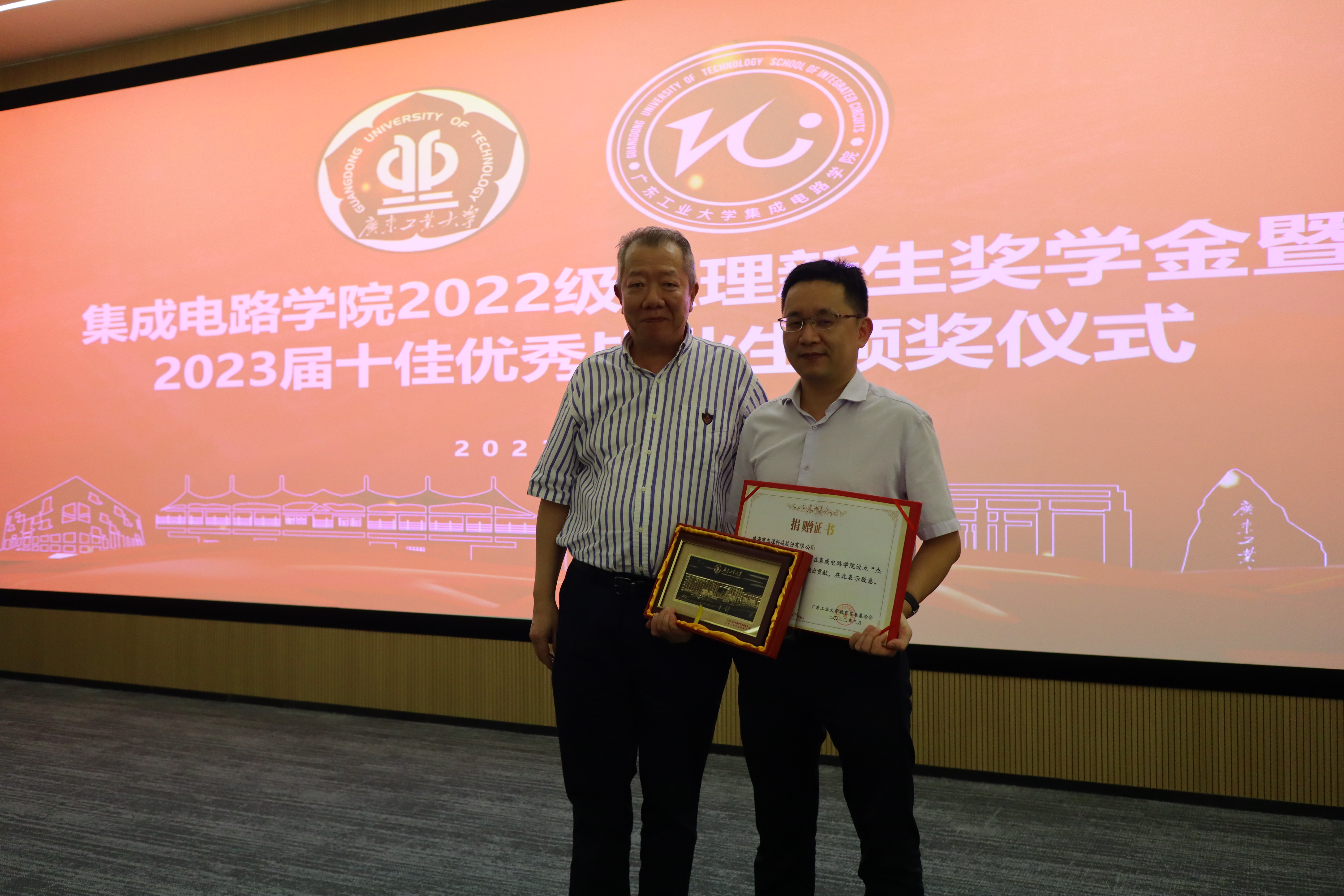 杰理颁发了捐赠证书并赠送纪念品,表达对杰理的感谢。院企双方代表为获奖学生颁奖并合影留念。