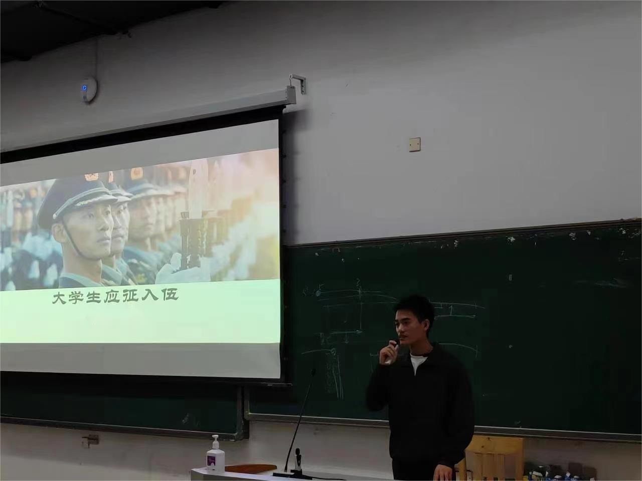 许升同学就征兵工作的政策法规、组织实施、优抚政策等方面强调了大学生参军入伍的重要意义。并结合自身的武警训练经历,以及大学生军人退役后享受就学就业优惠等优抚政策进行了详细的解读,鼓励各位有志青年积极参军入伍,投身军营。