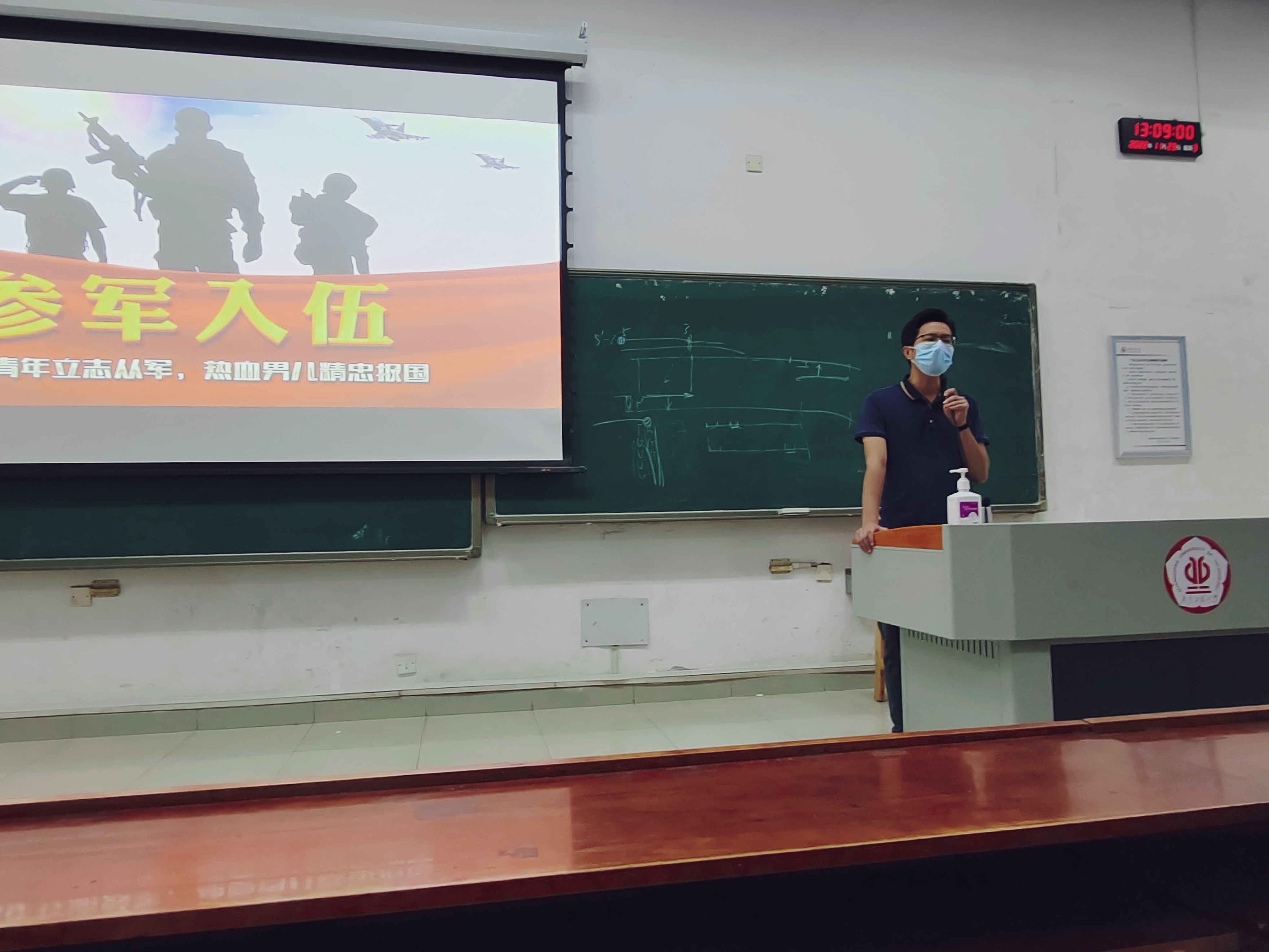 郭泽镇同学进行了简要的自我介绍,讲述了自己参军的原因——向往军旅生活,圆从军梦,并自豪的向同学们介绍了自己征兵服役时所处的海军陆战队以及加入军营后给自己带来的改变,并提醒有意向参军学生可能遇到的困难,希望有意向参军入伍的同学,要积极做好思想和身体上的准备,以最好的状态,去完成和实现自己充实的军旅生活。