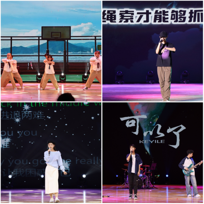 月华如水,歌声悠扬,第二篇章“灵韵开新章”在歌曲《Free Loop》中缓缓开启,歌声激发着观众的情感共鸣,鼓励人们勇敢地去追寻自己的内心所向,摆脱现实的困境和束缚;舞蹈《Hey!Hey!》在欢快的节奏带领同学们尽情领略校园时光的青春洋溢与朝气蓬勃;《Stuck In The Middle》唱响了成长的道路上置身两难境地的迷茫和纠结,也启示着同学们勇于走出舒适区,寻找应对困难的出路;说唱《玛瑙》用鼓舞人心的词句辅以充满张力的旋律诉说着青年学子一往无前、无所畏惧的精神风貌;舞蹈《Shooting Star》紧跟音乐的节奏,每一次转身、跳跃都精准有度、张弛有力,瞬间点燃了现场的气氛。