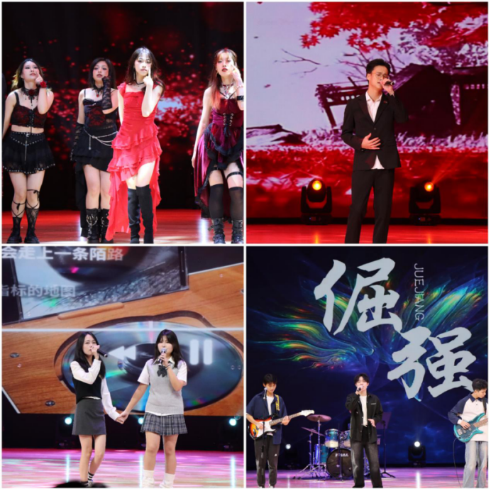 吉他激昂、贝斯厚重、鼓点紧凑,乐队用一首《可以了》将晚会带入第三篇章,激昂的歌声唱出动人的故事,将现场气氛推向顶峰。而后又用一首《倔强》带领大家共奔追梦路,每一次跌倒,都是成长的磨砺,每一次爬起,都是勇气的绽放;《Cry For Fe》和《二十二》分别用灵动的舞姿和欢快的旋律带领观众感受来自时代的脉动与未来的呼唤;晚会最后,两位同学的对唱《原谅》如同清风拂过心湖泛起层层涟漪,让人在回转的音符中品味情感的细腻与绵长,让每一缕音符都化作心底最柔软的触动,为晚会划上最圆满的句号。