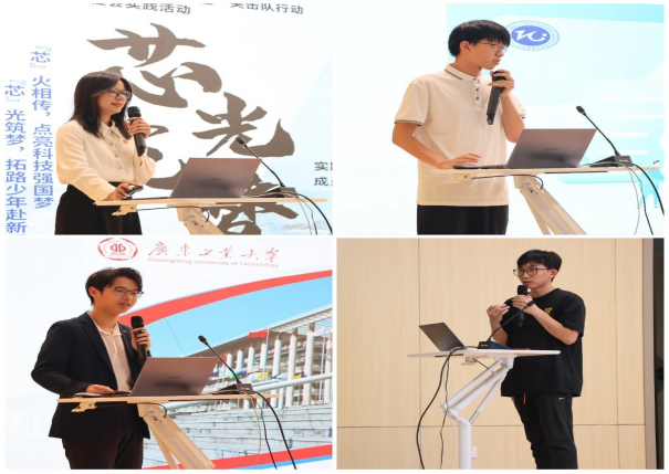 4支实践队伍分别围绕前期策划准备、活动开展、成果展示以及成长收获进行汇报交流。“芯火相传,点亮科技强国梦”突击队秉持“教育兴国、科技强国”的初心使命,深入惠来县葵潭镇慈云世铿中学开展科普宣讲、科普实验等活动,激发学生的科技兴趣和探究精神,同时宣传国家资助和助学贷款政策,惠及当地居民,助力乡村教育振兴。“科技聚焦乡村,集成助力振兴”实践队聚焦农村老人日常起居的安全问题,用科技力量赋能老年人关怀行动,主动担当社会责任。“童乐课堂,逐梦飞翔”实践队致力于弘扬传统文化,通过走访广宁县宾亨镇石涧武馆,采访黄飞鸿南派洪拳第六代传人王德金,学习洪拳文化,并为武馆拍摄制作宣传视频,让更多人知晓、了解中华武术文化。“红色探寻”实践团聚焦于贵州省遵义市这座充满红色记忆的城市,并围绕“红色基因的传承与实践”这一调研主题,赴习水县四渡赤水纪念馆开展实地调研,并形成调研报告反馈给当地相关部门,传承红色基因,弘扬中国共产党人精神谱系。