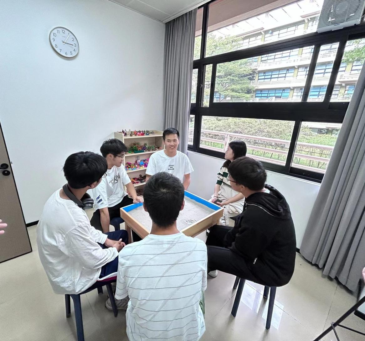 在沙盘游戏团辅活动中,团辅带领者陈遥引导同学们依据规则通过5轮的沙具摆放共同完成了一幅沙盘作品。此过程中,陈遥引导同学说出自己的真实想法、感受和体验,帮助同学们觉察自身、觉察他人、调节情绪,促使同学们疗愈自我并疏通情绪,真正看到自己、了解自己、关怀自己。