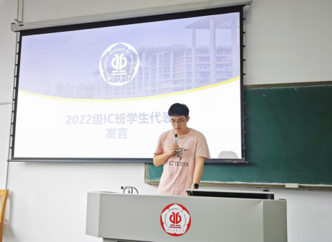 学生代表苏黄石同学首先感谢了学校、教务处以及集成电路设计联合学院为同学们搭建了多专业融合发展的平台,提供了良好的学习环境和丰富的学习资源。苏黄石同学结合交叉融合学科的机遇与挑战,立足班长的职责,分享了对IC班学习与生活的期待和向往,立志保持求知的热情,以脚踏实地的态度,为我国集成电路产业奋斗不已。