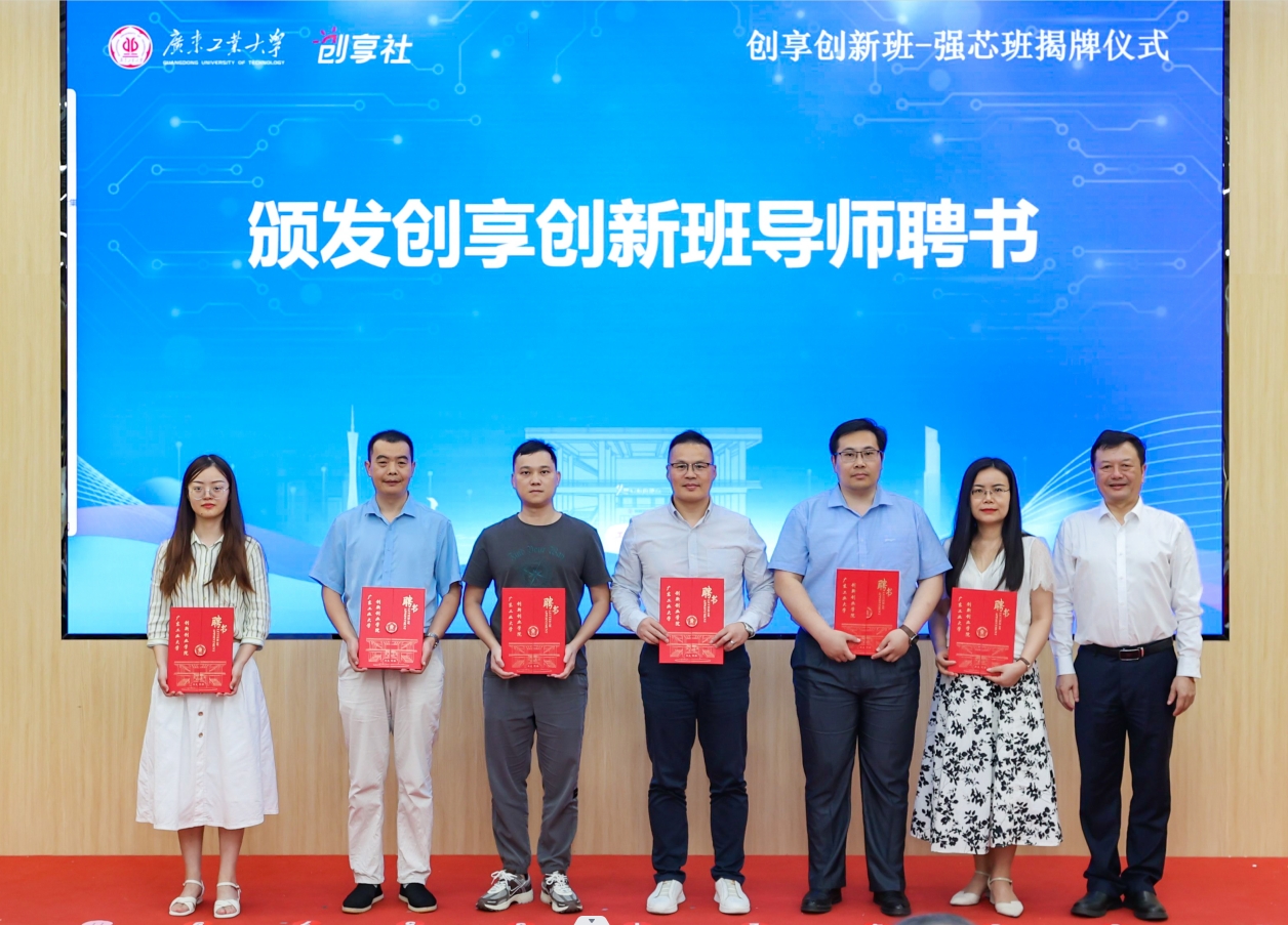 仪式上,还举行了创享创新班-强芯班授旗仪式与导师聘书颁发仪式,标志着学校首个创享创新班正式入驻工大创谷。仪式结束后,与会领导、企业嘉宾共同参观了创享创新班-强芯班工作室。