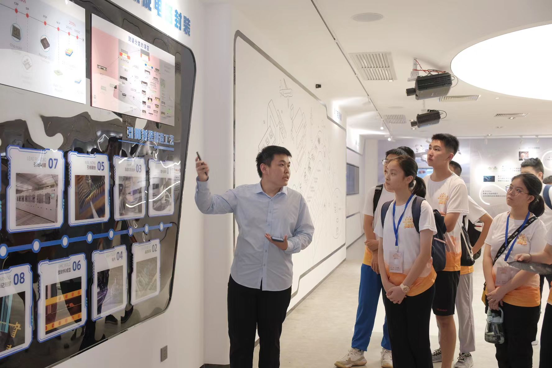 随后,学院“芯火宣讲团”带领营员们参观了学院的集成电路专业认知体验馆,从集成电路的发展历史、芯片制造、封装测试、发展前景等方面为他们进行了集成电路的科普讲解。集成电路专业认知体验馆是开展青少年科普的重要宣传阵地,“芯火宣讲团”的宣讲加深了营员们对于中国芯片事业的认知与理解。