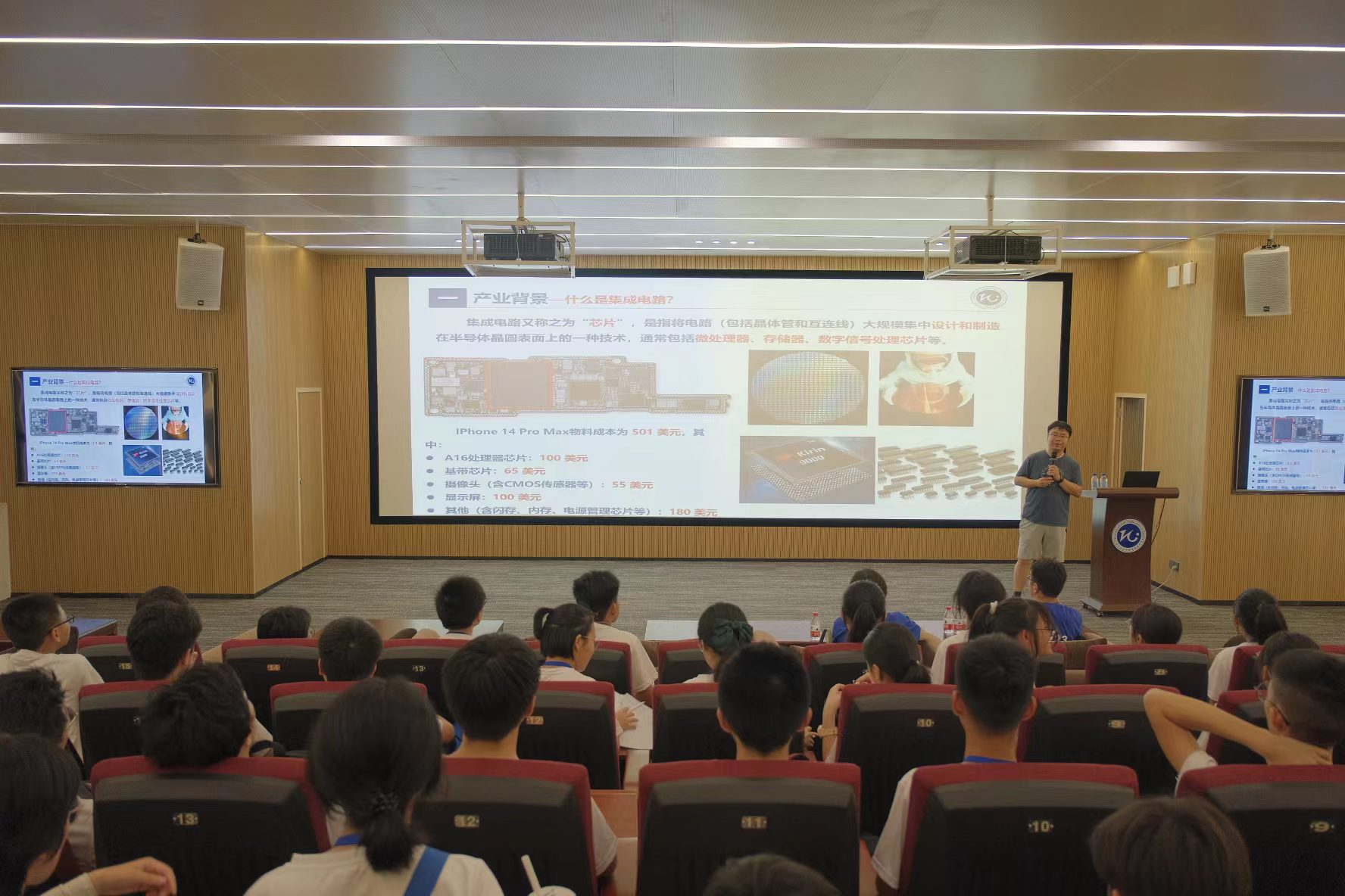 7月12日下午14:00,中学生科普夏令营参观队伍到达理学馆,在理学馆学术报告厅,学院副院长刘远向营员们介绍了学校和学院的整体情况,并从集成电路产业背景、学院基本情况、科研教学平台、人才培养成效、校企交流合作、学生活动剪影六个方面对学院进行了全面介绍,鼓励同学们积极认识集成电路专业。