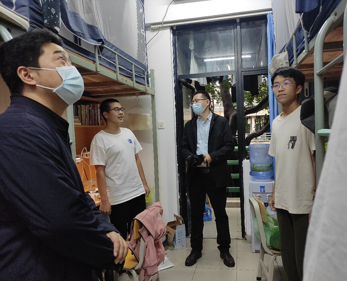 会议结束后,院党委书记沈彬、院党委副书记石宇杰带领辅导员戎明杰、蒋佳琪、刘艺涵一同走访学生宿舍,提醒学生们按时做核酸,在校内要正确佩戴口罩,非必要不外出。领导老师们的暖心叮嘱使学生们增强了防护意识,并且感受了学院的真诚关怀。