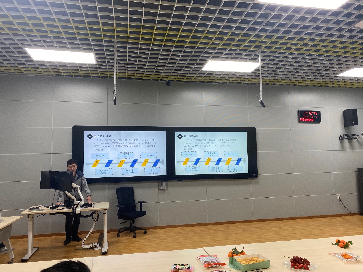 之后,2019级硕士研究生梁润华通过信息安全芯片设计的实际项目为例向同学们讲解了芯片设计的全流程知识以及实际流片过程中遇到的难题,分享了宝贵的芯片流片经验。