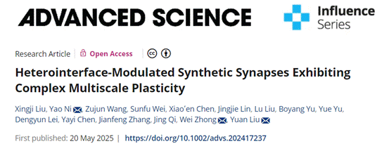 [1]Xingji Liu, Yao Ni, Dengyun Lei, Yayi Chen, Jianfeng Zhang, Jing Qi, Wei Zhong, Yuan Liu,et al. Heterointerface-Modulated Synthetic Synapses Exhibiting Complex Multiscale Plasticity. Advanced Science. DOI: 10.1002/advs.202417237